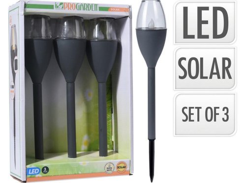 třídílná sada venkovních LED solárních lamp- vhodné k osvětlení celé zahrady, terasy, balkonu, verandy, chodníčků, altánků, atd...- určené k zapíchnutí do země ale např. i do květináčů- teplé bílé světlo, efekt plápolající svíčky- solární panel v horní části přes den lampu nabíjí, ta se večer při setmění spustí a svítí- lze kdykoliv i manuálně zapínat nebo vypínat tlačítkem- průměr 5 cm- celková výška i s bodcem: 38 cm- integrovaná baterie nabíjená slunečním zářením je součástí balení- sada obsahuje 3 ks svítidel