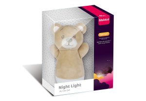 Lampička noční medvídek usínáček plyšový. Rozměry 11x8x15,5 cm. Aktivace přepínačem na spodní straně lampičky. Automaticky se měnící barevné světýlko (7 barev). 3xAAA baterie, nejsou součástí.