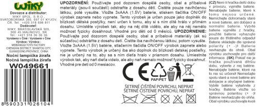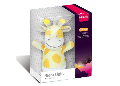 Lampička noční žirafa usínáček plyšový. Rozměry 11x8x15,5 cm. Aktivace přepínačem na spodní straně lampičky. Automaticky se měnící barevné světýlko (7 barev). 3xAAA (1.5V) baterie, nejsou součástí.