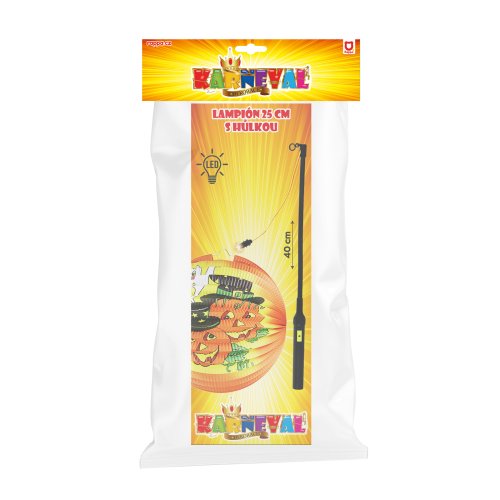 Papírový lampion s motivem dýně a k němu svítící hůlka. Ideální sada na Halloween párty nebo lampionový průvod! Hůlka vyžaduje 2 tužkové baterie typu AA, které nejsou součástí balení. Přepnutím spínače na rukojeti hůlka svítí.