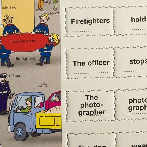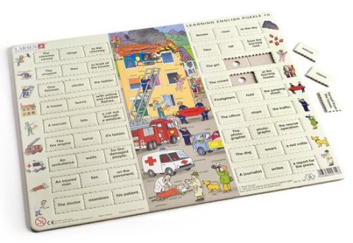 Puzzle pro výuku angličtiny - tvoření složitějších anglických vět. Pomoc! Co se stalo? Hoří dům! Co dělají lidé okolo? Zábavné učení angličtiny nejen pro děti. K jednotlivým obrázkům na okraji se přiřazují dílky tři dílky a tvoří se věty popisující situaci na obrázku uprostřed. Děti, které neznají anglické slovíčko patřící k obrázku na okraji, si jej mohou nejprve vyhledat na velkém obrázku. Každý dílek má jiný tvar a celé puzzle lze složit, jen když jsou všechny dílky umístěny správně.