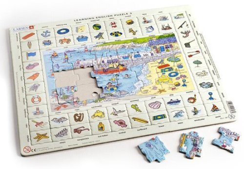 Puzzle pro výuku angličtiny - rozšíření české i anglické slovní zásoby. Co všechno se dá najít na pláže? A umíš pojmenovat vodní sporty? Zábavné učení anglických slovíček nejen pro děti. K jednotlivým abecedně seřazeným anglickým názvům na okraji se přiřazují dílky s obrázkem. Uprostřed je 18ti dílkové klasické puzzle, na kterém je vyobrazena kompletní scéna zahrnující výuková slovíčka včetně jejich anglického pojmenování. Děti, které neznají název anglicky nebo neví, co znamená, mohou nejprve vyobrazení nebo pojmenování vyhledat na obrázku uprostřed. Každý dílek má jiný tvar a celé puzzle lze složit, jen když jsou všechny dílky umístěny správně.