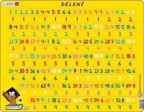 Puzzle s jednoduchými početními příklady na procvičování dělení. Děti se učí dělit zábavnou formou, musí umístit dílek ke správnému výsledku. Dílky je možné vložit pouze na správné místo. Puzzle je v češtině.