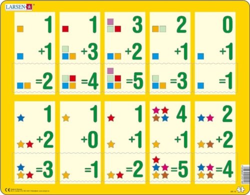 Výukové puzzle pro děti s početními příklady na procvičování sčítání, ke kterému stačí prsty jedné ruky. Je vhodné i pro mladší děti, které nerozpoznají číslice, jelikož je u každého čísla znázorněn příslušný počet čtverečků nebo hvězdiček, které lze spočítat. Dítě má za úkol doplnit výsledek, přičemž dílky lze umístit pouze v případě, že je úloha vyřešena správně.