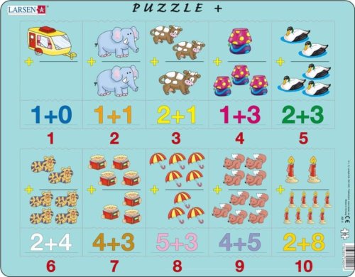 Deskové výukové puzzle, které děti učí počítat pomocí obrázků. K deseti výsledkům je třeba dvěma dílky doplnit zadání příkladu: dílkem s obrázky a dílkem s číselným zápisem. Každý dílek má jiný tvar a dílek lze umístit pouze na správné místo.