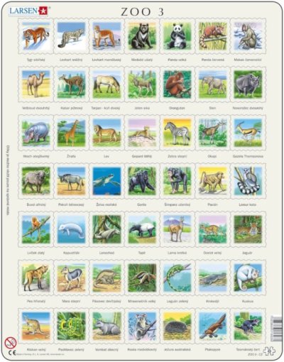 Určitě znáš zebru, krokodýla nebo paviána... Ale víš, že mezi zvířaty žije i kuskus nebo tasmánský čert a psohlavec zelený není vůbec savec? Puzzle LARSEN, to je učení, které baví! Edukativní rámkové puzzle Zvířata světa ti ukáže 49 známých i méně známých obyvatel naší planety. K jednotlivým názvům se přiřazuje dílek s obrázkem. Každý dílek má jiný tvar a celé puzzle lze složit, jen když jsou všechny dílky umístěny správně. Puzzle je v češtině.
