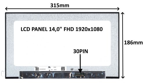 Úhlopříčka: 14,0" Rozlišení: 1920x1080 FHD Konektor: 30 PIN Typ podsvícení: LED Povrch LCD panelu: MATNÝ Technologie LCD panelu: IPS Rozměry: Šířka: 315 mm Výška: 186 mm Způsob uchycení LCD panelu: bez úchytů - lepení k LCD krytu Záruka: 24 měsíců i na vadné pixely