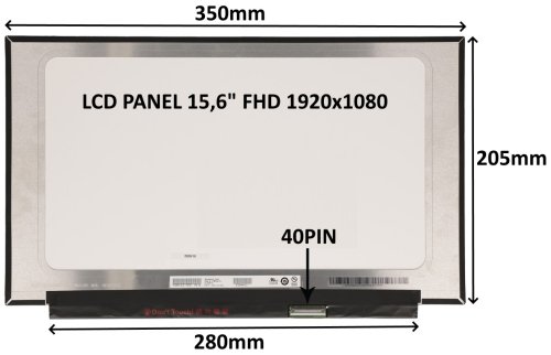 Úhlopříčka: 15,6" Rozlišení: 1920x1080 FHD Konektor: 40 PIN Typ podsvícení: LED Povrch LCD panelu: MATNÝ Technologie LCD panelu: IPS Rozměry: Šířka: 350 mm Výška: 205 mm Délka invertoru: 280 mm Způsob uchycení LCD panelu: bez úchytů - lepení k LCD krytu Záruka: 24 měsíců i na vadné pixely