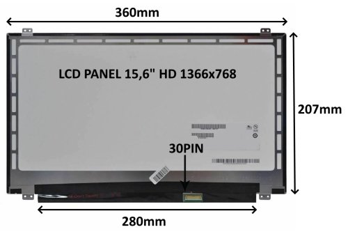 Úhlopříčka: 15,6" Rozlišení: 1366x768 HD Konektor: 30 PIN Typ podsvícení: LED Povrch LCD panelu: LESKLÝ Technologie LCD panelu: TN Rozměry: Šířka: 360 mm Výška: 207 mm Délka invertoru: 280 mm Způsob uchycení LCD panelu: úchyty nahoře a dole Záruka: 24 měsíců i na vadné pixely