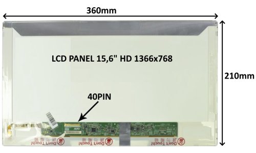 Úhlopříčka: 15,6" Rozlišení: 1366x768 HD Konektor: 40 PIN Typ podsvícení: LED Povrch LCD panelu: LESKLÝ Technologie LCD panelu: TN Rozměry: Šířka: 360 mm Výška: 210 mm Způsob uchycení LCD panelu: šroubování z boků Záruka: 24 měsíců i na vadné pixely