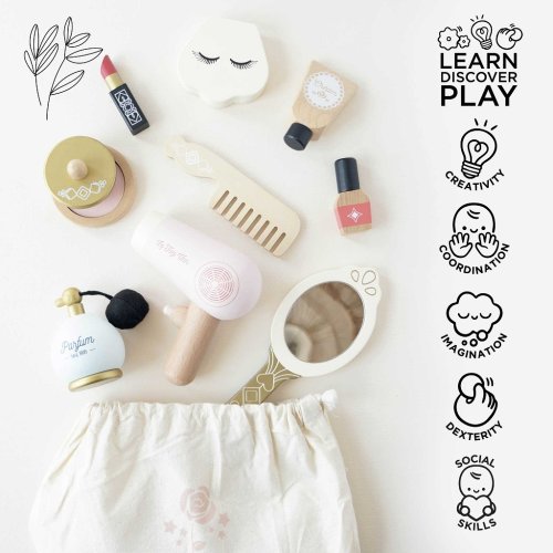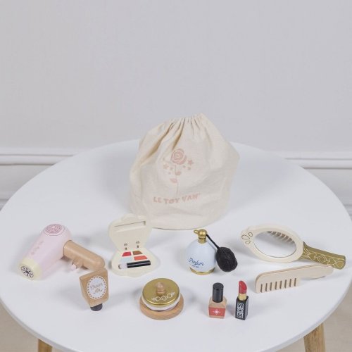 Buďte hvězdami ve vlastní show! Kosmetickou tašku si zamilují malé kostymérky a kostyméři, s jejím obsahem vytvoří úžasný make-up a účes. Taška je vyrobena z přírodní bavlny, její vybavení je z hladkého a zaobleného dřeva, to vše je ručně malováno netoxickými barvami. Malí vizážisté a vizážistky mohou začít tvořit své dílo. Nechybí krém, oční stíny a aplikátor, pudr a labutěnka, parfém, rtěnka, fén, hřeben, zrcátko, lak na nehty a štěteček, textilní pytlík. Perfektní hračka pro hru na role je vyrobena z FSC dřeva, zdobí ji barvy, které jsou bezpečné pro děti. Hlavní vlastnosti: taška z přírodní bavlny, dřevěné doplňkyFSC dřevovyrobeno eticky s láskoutestováno dle nejpřísnějších standardůmalováno netoxickými barvami na bázi vodyinspiruje k představivé hře Honeybake kolekce: Hračky v této kolekci jsou vhodné k objevování, pomohou dětem s rozvojem představivosti, sociálních a verbálních dovedností a kognitivních funkcí. Tradiční design s moderními detaily děti jistě bude bavit. Honeybake je kolekce Le Toy Van, která vyhrála nejvíce ocenění, a to za design, kvalitu, bezpečnost a také za vzdělávací a herní hodnotu. Značka a certifikát FSC® (Forest Stewardship Council) zaručuje, že dřevo, ze kterého byl produkt vyroben, nebylo vytěženo nelegálně a pochází z lesů obhospodařovaných šetrným či přírodě blízkým způsobem, ve kterém jsou dodržovány přísné environmentální a sociální požadavky. Značka FSC® na výrobku znamená, že svým nákupem pomáháte chránit lesy a podporujete šetrné, odpovědné či přírodě blízké hospodaření, díky kterému jsou naše lesy stabilnější, zdravější, mají přirozenou druhovou skladbu a lépe odolávají negativním následkům klimatických změn.