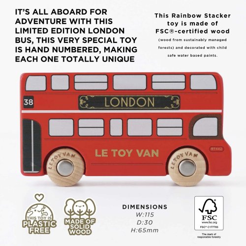 Vydejte se za dobrodružstvím s limitovanou edicí londýnského autobusu! Tato hračka z odolného dřeva je vyrobena a ručně očíslována ve Velké Británii - každý kus je zcela jedinečný! Lakovaný v tradiční červené barvě s elegantními zlatými detaily a robustními koly je kompatibilní se všemi garážemi a vláčkodráhami z řad Le Toy Van. Autobus je ze dřeva s certifikací FSC® (dřevo z lesů obhospodařovaných udržitelným způsobem) a ozdoben barvami na vodní bázi bezpečnými pro děti. Hračky s účelemVšechny hračky firmy Le Toy Van jsou vyrobeny s cílem – aby dlouho vydržely. Designovány s láskou zkušenými řemeslníky za použití etických praktik a udržitelných materiálů, které jsou laskavější k naší planetě. Hlavní vlastnosti: vyrobeno eticky z FSC udržitelného dřevamalováno netoxickými barvami na bázi vodytestováno dle nejpřísnějších standardůlimitovaná edice ručně očíslovaných autobusů (pouze 1000 ks celosvětově)klasický vintage červený designvyrobeno ve Velké Británii Auta & stavby: Stavební a motorická kolekce Le Toy Van, která vyhrála mnoho ocenění. Přesněji prozatím přes 15 ocenění za představivá auta a stavební hračky. Podporují dětskou fantazii, jsou ideální k představivé hře, rozvíjí kreativitu a hravě zlepšují dětskou koordinaci ruka‑oko. Značka a certifikát FSC® (Forest Stewardship Council) zaručuje, že dřevo, ze kterého byl produkt vyroben, nebylo vytěženo nelegálně a pochází z lesů obhospodařovaných šetrným či přírodě blízkým způsobem, ve kterém jsou dodržovány přísné environmentální a sociální požadavky. Značka FSC® na výrobku znamená, že svým nákupem pomáháte chránit lesy a podporujete šetrné, odpovědné či přírodě blízké hospodaření, díky kterému jsou naše lesy stabilnější, zdravější, mají přirozenou druhovou skladbu a lépe odolávají negativním následkům klimatických změn.