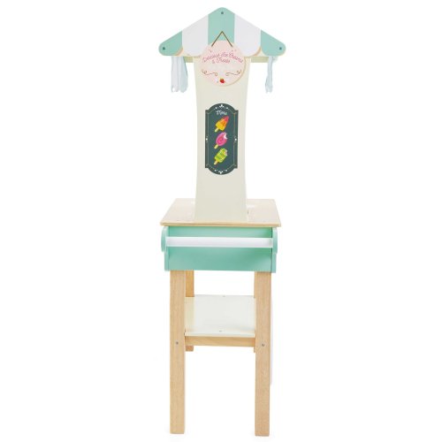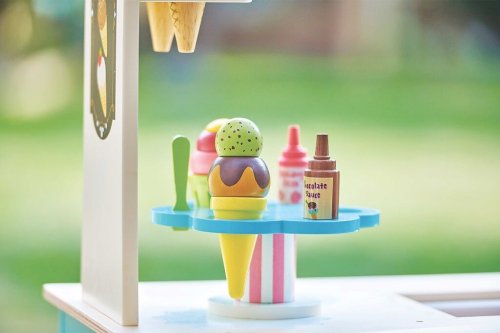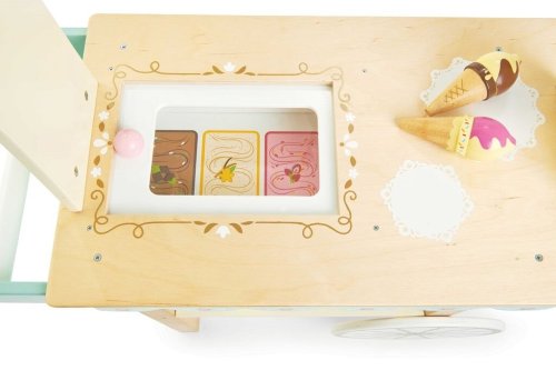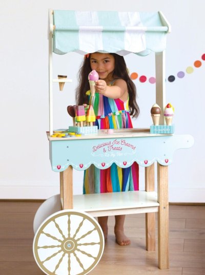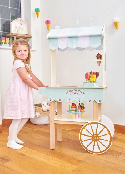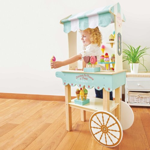 Letní občerstvení! Se stylovým zmrzlinovým vozíkem, který se v dnešní době vidí opravdu zřídkakdy, si děti mohou zahrát na zmrzlináře a zmrzlinářky. Retro zmrzlinový vozík je perfektní pro představivou hru v dětském pokoji i na zahradě. Klasický pruhovaný látkový baldachýn, pastelové barvy a zlaté detaily, tato skutečně jedinečná hračka je vyrobena z udržitelného dřeva a designována tak, aby vydržela mnoho let představivé hry. Má mnoho realistických funkcí, které mohou děti objevovat během hry. Přihrádku na led s posuvnými dveřmi, které odhalí ilustrace klasických příchutí zmrzliny, dva magnetické kornouty na zmrzlinu, pohyblivá kolečka, díky kterým budou moct zmrzlinu servírovat kdekoliv. Hračky s účelemVšechny hračky firmy Le Toy Van jsou vyrobeny s cílem – aby dlouho vydržely. Designovány s láskou zkušenými řemeslníky za použití etických praktik a udržitelných materiálů, které jsou laskavější k naší planetě. Hlavní vlastnosti: vyrobeno eticky z udržitelného dřevatestováno dle nejpřísnějších standardůmalováno netoxickými barvami na bázi vodyinspiruje k představivé hřevhodné pro hru na rolehračka vyhrála ocenění Ocenění hračky:Right Start Top Investment Award 2019Right Start Winner 2019Good Toy Guide Recommended Honeybake kolekce: Hračky v této kolekci jsou vhodné k objevování, pomohou dětem s rozvojem představivosti, sociálních a verbálních dovedností a kognitivních funkcí. Tradiční design s moderními detaily děti jistě bude bavit. Honeybake je kolekce Le Toy Van, která vyhrála nejvíce ocenění, a to za design, kvalitu, bezpečnost a také za vzdělávací a herní hodnotu.