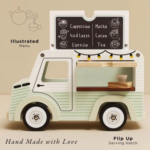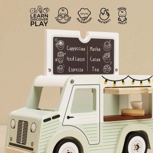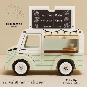 Mobilní kavárna Street coffee.Tato stylová dodávka ve vintage designu je vyrobená z FSC® certifikovaného dřeva, natřená jemnou pistáciově zelenou a bílou barvou. Díky krásně zpracovaným detailům a ilustracím po všech stranách zaujme na první pohled. Stříška se dá snadno otevřít – uvnitř se ukrývá menu s nabídkou kávy a čaje. Přední výdejní okénko zase umožňuje malým baristům obsluhovat své zákazníky jako v opravdové pojízdné kavárně. Hlavní vlastnosti: retro kavárenská dodávkaservírovací tác s hrníčkem a croissantemotočná stříška a otevírací okénkovyrobeno z FSC® dřeva testováno dle nejpřísnějších standardůbarveno netoxickými barvami na bázi vodyinspiruje ke kreativní a představivé hřepodporuje rozvoj dětí díky hraní na role Značka a certifikát FSC® (Forest Stewardship Council) zaručuje, že dřevo, ze kterého byl produkt vyroben, nebylo vytěženo nelegálně a pochází z lesů obhospodařovaných šetrným či přírodě blízkým způsobem, ve kterém jsou dodržovány přísné environmentální a sociální požadavky. Značka FSC® na výrobku znamená, že svým nákupem pomáháte chránit lesy a podporujete šetrné, odpovědné či přírodě blízké hospodaření, díky kterému jsou naše lesy stabilnější, zdravější, mají přirozenou druhovou skladbu a lépe odolávají negativním následkům klimatických změn.