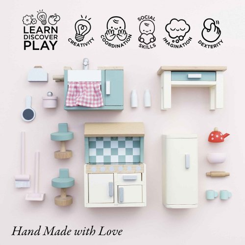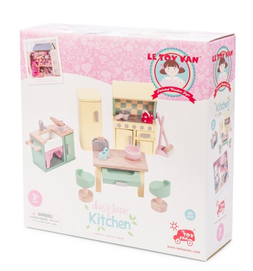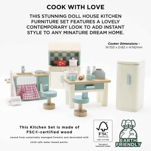 Žádný domeček pro panenky není kompletní bez vybavené kuchyně. S tímto krásným dřevěným setem do kuchyně mohou děti uvařit nebo upéct něco dobrého pro své miniaturní hosty. Tento představivý set s důrazem na detail se skládá z dřezu, sporáku, trouby s otevíratelnými dveřmi, velké lednice s otevíratelnými dveřmi, stolu s 2 židličkami, na kterém můžete krájet a připravovat. Velikostně se hodí do domečků pro panenky od Le Toy Van, více doplňků domečků z řady Daisylane najdete na našem webu. Hračky s účelemVšechny hračky firmy Le Toy Van jsou vyrobeny s cílem – aby dlouho vydržely. Designovány s láskou zkušenými řemeslníky za použití etických praktik a udržitelných materiálů, které jsou laskavější k naší planetě. Hlavní vlastnosti: měřítko 1:12vyrobeno eticky z udržitelných materiálůtestováno dle nejpřísnějších standardůmalováno netoxickými barvami na bázi vodytrénuje komunikační dovednosti a koordinaciinspiruje ke kreativní a představivé hře Daisylane kolekce: Prestižní kolekce domečků pro panenky a doplňků firmy Le Toy Van. Před více než 25 lety zakladatel Georges navrhl svůj úplně první domeček pro panenky, stavební kámen této firmy. Vyrobeno eticky z udržitelných materiálů, dřevěné domečky pro panenky Daisylane jsou jedinečné a nebudou dětskou představivost držet zpátky. Rodinné dědictví, opravdová investice do hraní. Značka a certifikát FSC® (Forest Stewardship Council) zaručuje, že dřevo, ze kterého byl produkt vyroben, nebylo vytěženo nelegálně a pochází z lesů obhospodařovaných šetrným či přírodě blízkým způsobem, ve kterém jsou dodržovány přísné environmentální a sociální požadavky. Značka FSC® na výrobku znamená, že svým nákupem pomáháte chránit lesy a podporujete šetrné, odpovědné či přírodě blízké hospodaření, díky kterému jsou naše lesy stabilnější, zdravější, mají přirozenou druhovou skladbu a lépe odolávají negativním následkům klimatických změn.
