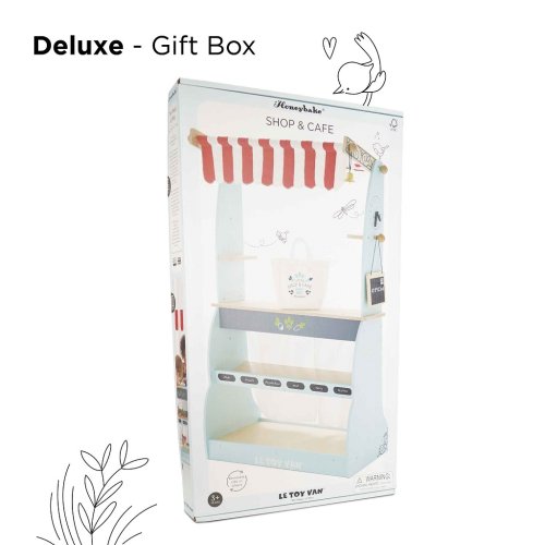 Skvělý a všemi oblíbený dřevěný prodejní pult vyhrál několik ocenění! Dětem poslouží jako obchod i kavárna, opravdu záleží jen na jejich představivosti. Pult 2 v 1 stačí otočit, na jedné straně má prodejní police, do kterých se vejdou bedýnky a produkty, na straně druhé prostor vhodný pro přípravu a servírování horkých nápojů. Nechybí ani oboustranná tabulka na křídu, textilní nákupní taška a zvoneček. Děti si při představivé hře procvičí nejen sociální dovednosti. Lze kombinovat s bedýnkami s jídlem od Le Toy Van. Hračky s účelemVšechny hračky firmy Le Toy Van jsou vyrobeny s cílem – aby dlouho vydržely. Designovány s láskou zkušenými řemeslníky za použití etických praktik a udržitelných materiálů, které jsou laskavější k naší planetě. Hlavní vlastnosti: vyrobeno eticky z udržitelného dřevatestováno dle nejpřísnějších standardůmalováno netoxickými barvami na bázi vodyinspiruje k představivé hřerozvíjí kognitivní dovednostikolečka pro jednoduchý transport Ocenění hračky:Junior Design Bronze Award 2017Good Toy Guide RecommendedRight Start Best Toy Award Winner 2017 Honeybake kolekce: Hračky v této kolekci jsou vhodné k objevování, pomohou dětem s rozvojem představivosti, sociálních a verbálních dovedností a kognitivních funkcí. Tradiční design s moderními detaily děti jistě bude bavit. Honeybake je kolekce Le Toy Van, která vyhrála nejvíce ocenění, a to za design, kvalitu, bezpečnost a také za vzdělávací a herní hodnotu.