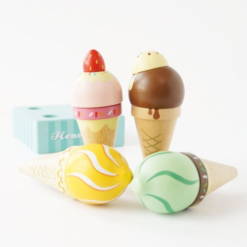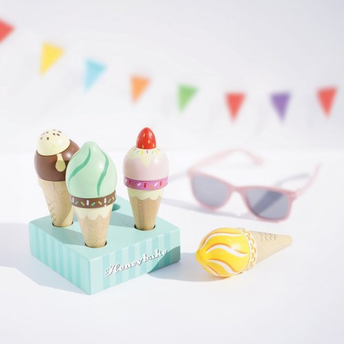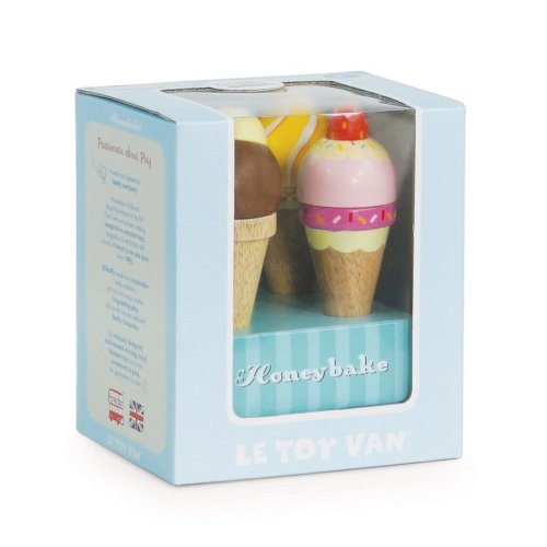 Jednu čokoládovou! S touto sladkou sadou čtyř ručně malovaných kornoutů zmrzliny budou děti moci servírovat osvěžení při představivé hře. Krásně zdobené kornouty zmrzliny jsou vyrobeny z masivního kaučukového dřeva, malovány realisticky s rozdílnými detaily a jsou doplněny o robustní dřevěný stojan. Při hře si děti procvičí koordinaci ruka-oko a jemnou motoriku. Hračky s účelemVšechny hračky firmy Le Toy Van jsou vyrobeny s cílem – aby dlouho vydržely. Designovány s láskou zkušenými řemeslníky za použití etických praktik a udržitelných materiálů, které jsou laskavější k naší planetě. Hlavní vlastnosti: vyrobeno eticky z udržitelného dřevatestováno dle nejpřísnějších standardůmalováno netoxickými barvami na bázi vodyinspiruje k představivé hřevhodné pro hru na role Honeybake kolekce: Hračky v této kolekci jsou vhodné k objevování, pomohou dětem s rozvojem představivosti, sociálních a verbálních dovedností a kognitivních funkcí. Tradiční design s moderními detaily děti jistě bude bavit. Honeybake je kolekce Le Toy Van, která vyhrála nejvíce ocenění, a to za design, kvalitu, bezpečnost a také za vzdělávací a herní hodnotu.