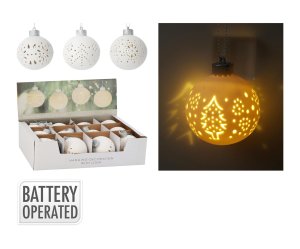 Dekorativní LED koule o rozměru 90×90×100 mm vyrobená z dolomitu, zdobená vyřezávanými motivy. Jednotlivé kusy jsou dodávány v mixu různých motivů v elegantním bílém provedení.