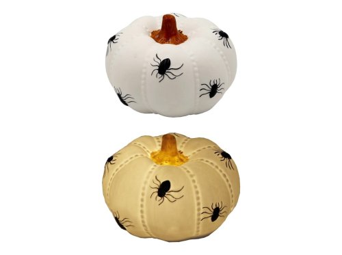 LED kameninová dýně o rozměru 98 × 126 mm je zdobena motivem pavouků, ideální pro Halloween. LED světlo poskytuje hřejivou a bezpečnou atmosféru bez otevřeného ohně. Skvělá pro stolní aranžmá, parapet nebo malé výzdoby.
