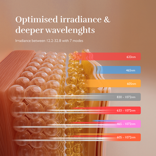 Režim 1 – Červené světlo (633 nm): vyhlazuje vrásky, stimuluje tvorbu kolagenu a zlepšuje mikrocirkulaci pro mladší vzhled. Režim 2 – Modré světlo (463 nm): bojuje proti akné, redukuje zarudnutí a vyrovnává produkci kožního mazu pro čistší pleť. Režim 3 – Jantarové světlo (605 nm): zesvětluje pigmentové skvrny, zklidňuje pleť a sjednocuje její tón. Režim 4 – NIR + Deep NIR (830 nm + 1072 nm): redukuje vrásky, stimuluje tvorbu kolagenu a elastinu, zlepšuje prokrvení a pevnost pokožky v hlubších vrstvách. Režim 5 – Červené + NIR + Deep NIR (633 nm + 830 nm + 1072 nm): působí od dermis po hypodermis, cílí na pokročilé známky stárnutí a podporuje buněčnou regeneraci. Režim 6 – Purpurové světlo (kombinace červeného, modrého, NIR a Deep NIR): komplexně bojuje proti akné i stárnutí pleti. Režim 7 – Tmavě oranžové světlo (červené + jantarové + NIR + Deep NIR): sjednocuje tón, zpevňuje a pozvedá kontury obličeje pro mladistvější vzhled.