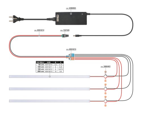 V jedné sérii paralelního zapojení nesmí celkový proud přesáhnout 4 A. Pokud má jeden LED pásek proud 0,5 A, můžete v jedné sérii zapojit maximálně 7 pásků (7 × 0,5 A = 3,5 A) - hodnoty viz tabulka.