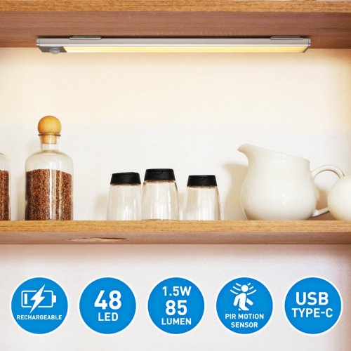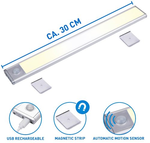 Tato LED lampa Grundig s pohybovým senzorem je praktickým a energeticky účinným řešením osvětlení. Díky integrovanému pohybovému senzoru se lampa automaticky zapne, když je potřeba. Uchycení je snadné pomocí dvou magnetických proužků, které LED pásek bezpečně drží. Nabíjení je snadné a provádí se pomocí přiloženého USB-C kabelu. Když je čas nabít LED světlo, jednoduše jej vyjměte z magnetického držáku. Díky 40 energeticky účinným LED diodám poskytuje tato lampa jas 85 lumenů při spotřebě pouze 1,5 wattu. Ideální pro použití v šatníku nebo jako noční světlo s pohybovým senzorem.Specifikace žárovky Grundig LEDUSB dobíjecí (USB-C)Pohybový senzor85 lumenů / 1,5 wattu