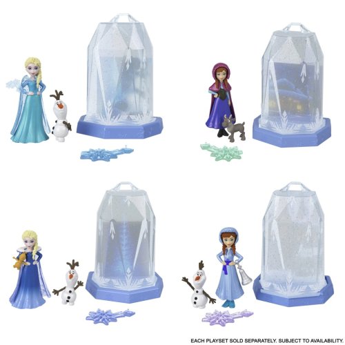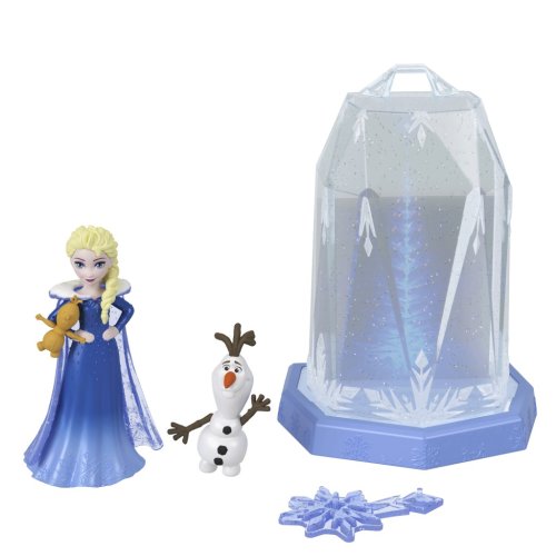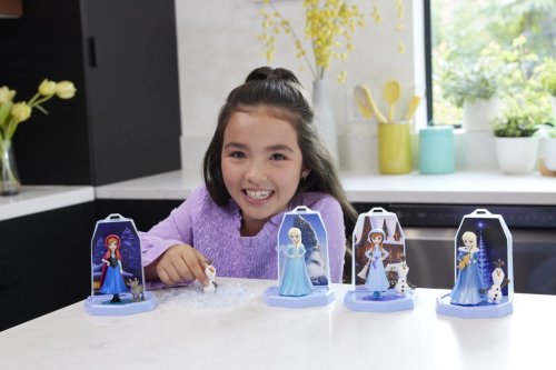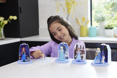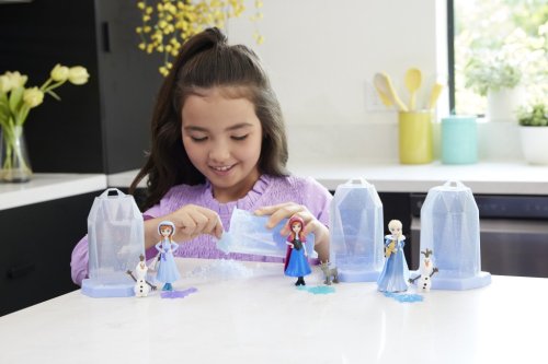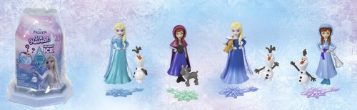 Tato kolekce malých panenek s překvapeními nabízí inovativní zážitek při rozbalování díky Squishy Ice™ – ledově modré želé směsi. Děti se pomocí přiložené lopatky prohrabou nádobkou se Squishy Ice™ a objeví poklady uvnitř: malou panenku Annu nebo Elsu, postavičku kamaráda a 4 hrací prvky.