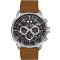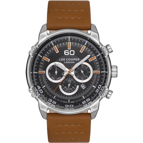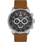 Pánské náramkové hodinky Napájení z baterie Průměr pouzdra 46,0 mm Pouzdro ve tvaru kruhu Kovové pouzdro Stříbrná barva pouzdra Kožený tah Hnědá barva tahu Ručičkový ciferník Černá barva ciferníku Ciferník s dvanácti indexy Materiál skla - minerální sklo Odolné proti vodě při běžném nošení Datum