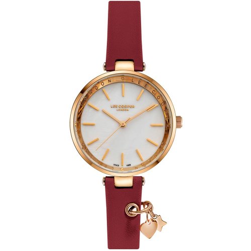 Dámské náramkové hodinky Napájení z baterie Průměr pouzdra 33,0 mm Pouzdro ve tvaru kruhu Kovové pouzdro Růžové zlato barva pouzdra Kožený tah Fialová barva tahu Ručičkový ciferník PERLEŤOVÁ barva ciferníku Ciferník s dvanácti indexy Materiál skla - minerální sklo Odolné proti vodě při běžném nošení