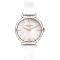 Dámské náramkové hodinky Napájení z baterie Průměr pouzdra 34,0 mm Pouzdro ve tvaru kruhu Kovové pouzdro Růžové zlato barva pouzdra Kožený tah Bílá barva tahu Ručičkový ciferník Bílá barva ciferníku Ciferník s dvanácti indexy Materiál skla - minerální sklo Odolné proti vodě při běžném nošení