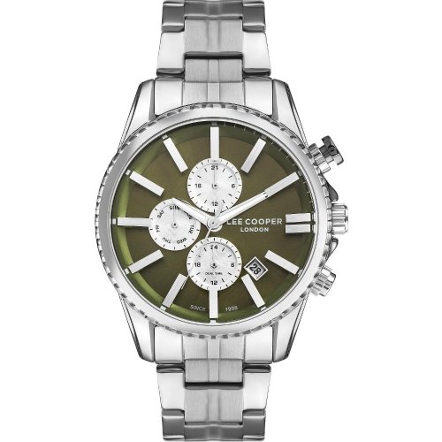 Pánské náramkové hodinky Napájení z baterie Průměr pouzdra 44,0 mm Pouzdro ve tvaru kruhu Kovové pouzdro Stříbrná barva pouzdra Ocelový tah Stříbrná barva tahu Ručičkový ciferník Zelená barva ciferníku Ciferník s dvanácti indexy Materiál skla - minerální sklo Odolné proti vodě při běžném nošení Datum Druhý čas