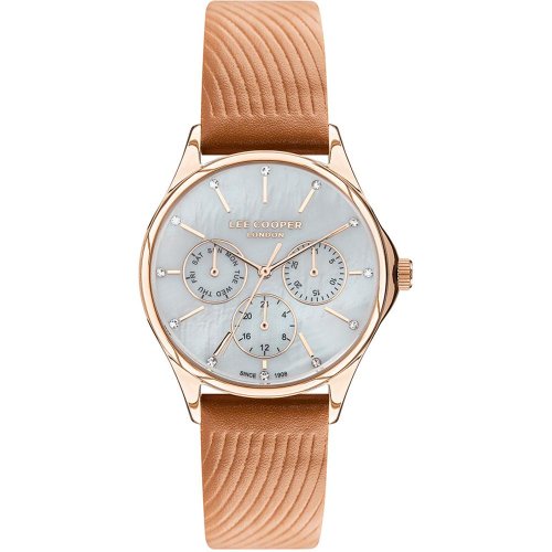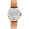 Dámské náramkové hodinky Napájení z baterie Průměr pouzdra 36,0 mm Pouzdro ve tvaru kruhu Kovové pouzdro Růžové zlato barva pouzdra Kožený tah Hnědá barva tahu Ručičkový ciferník PERLEŤOVÁ barva ciferníku Ciferník s dvanácti indexy Materiál skla - minerální sklo Odolné proti vodě při běžném nošení Datum