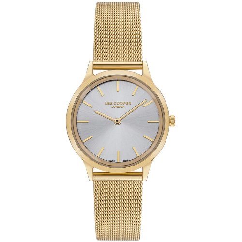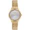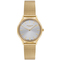 Dámské náramkové hodinky Napájení z baterie Průměr pouzdra 33,0 mm Pouzdro ve tvaru kruhu Kovové pouzdro Zlatavá barva pouzdra Kovový tah Zlatavá barva tahu Ručičkový ciferník Stříbrná barva ciferníku Ciferník s dvanácti indexy Materiál skla - minerální sklo Odolné proti vodě při běžném nošení