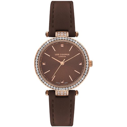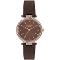 Dámské náramkové hodinky Napájení z baterie Průměr pouzdra 33,0 mm Pouzdro ve tvaru kruhu Kovové pouzdro Růžové zlato barva pouzdra Kožený tah Hnědá barva tahu Ručičkový ciferník Hnědá barva ciferníku Ciferník s dvanácti indexy Materiál skla - minerální sklo Odolné proti vodě při běžném nošení