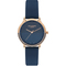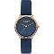 Dámské náramkové hodinky Napájení z baterie Průměr pouzdra 34,0 mm Pouzdro ve tvaru kruhu Kovové pouzdro Růžové zlato barva pouzdra Kožený tah TMAVO MODRÁ barva tahu Ručičkový ciferník Černá barva ciferníku Ciferník s dvanácti indexy Materiál skla - minerální sklo Odolné proti vodě při běžném nošení