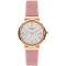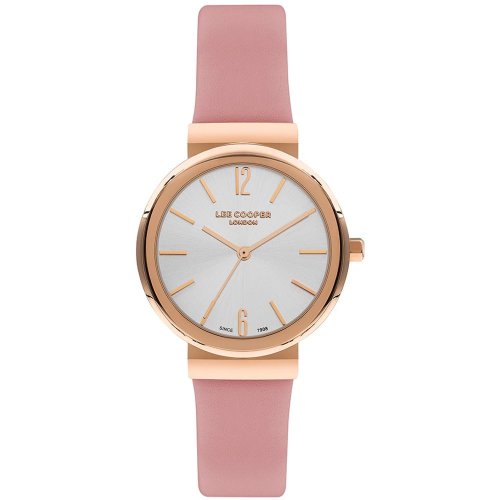 Dámské náramkové hodinky Napájení z baterie Průměr pouzdra 34,0 mm Pouzdro ve tvaru kruhu Kovové pouzdro Růžové zlato barva pouzdra Kožený tah Růžová barva tahu Ručičkový ciferník Stříbrná barva ciferníku Ciferník s dvanácti indexy Materiál skla - minerální sklo Odolné proti vodě při běžném nošení
