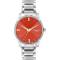 Pánské náramkové hodinky Napájení z baterie Průměr pouzdra 44,0 mm Pouzdro ve tvaru kruhu Kovové pouzdro Stříbrná barva pouzdra Kovový tah Stříbrná barva tahu Ručičkový ciferník Oranžová barva ciferníku Ciferník s dvanácti indexy Materiál skla - minerální sklo Odolné proti vodě při běžném nošení