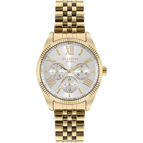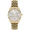Dámské náramkové hodinky Napájení z baterie Průměr pouzdra 37,0 mm Pouzdro ve tvaru kruhu Kovové pouzdro Zlatavá barva pouzdra Kovový tah Zlatavá barva tahu Ručičkový ciferník Stříbrná barva ciferníku Ciferník s dvanácti indexy Materiál skla - minerální sklo Odolné proti vodě při běžném nošení