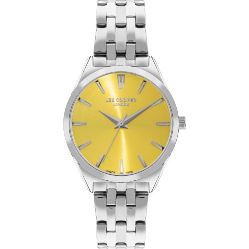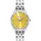 Dámské náramkové hodinky Napájení z baterie Průměr pouzdra 33,0 mm Pouzdro ve tvaru kruhu Kovové pouzdro Stříbrná barva pouzdra Kovový tah Stříbrná barva tahu Ručičkový ciferník Žlutá barva ciferníku Ciferník s dvanácti indexy Materiál skla - minerální sklo Odolné proti vodě při běžném nošení