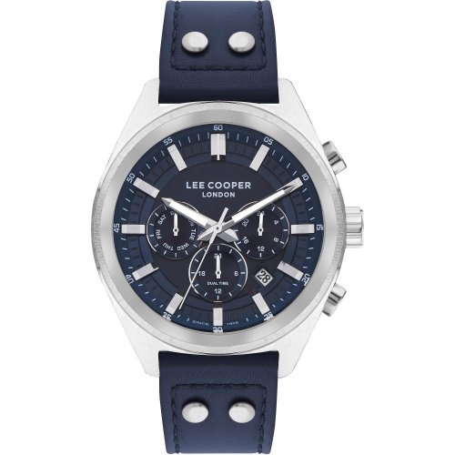 Pánské náramkové hodinky Napájení z baterie Průměr pouzdra 44,0 mm Pouzdro ve tvaru kruhu Kovové pouzdro Stříbrná barva pouzdra Kožený tah TMAVO MODRÁ barva tahu Ručičkový ciferník TMAVO MODRÁ barva ciferníku Ciferník s dvanácti indexy Materiál skla - minerální sklo Odolné proti vodě při běžném nošení