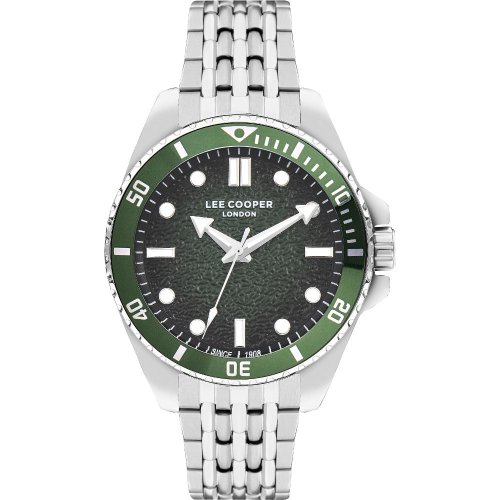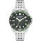 Pánské náramkové hodinky Napájení z baterie Průměr pouzdra 43,0 mm Pouzdro ve tvaru kruhu Kovové pouzdro Stříbrná barva pouzdra Kovový tah Stříbrná barva tahu Ručičkový ciferník Zelená barva ciferníku Ciferník s dvanácti indexy Materiál skla - minerální sklo Odolné proti vodě během sprchování a mytí