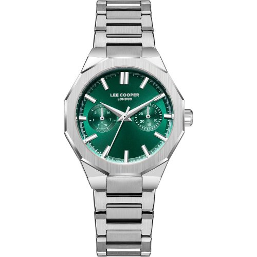 Dámské náramkové hodinky Napájení z baterie Průměr pouzdra 34,0 mm Pouzdro ve tvaru kruhu Kovové pouzdro Stříbrná barva pouzdra Kovový tah Stříbrná barva tahu Ručičkový ciferník Zelená barva ciferníku Ciferník s dvanácti indexy Materiál skla - minerální sklo Odolné proti vodě při běžném nošení