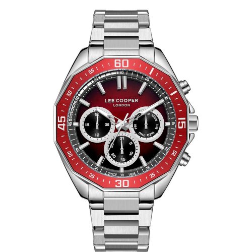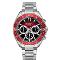 Pánské náramkové hodinky Napájení z baterie Průměr pouzdra 45,0 mm Pouzdro ve tvaru kruhu Kovové pouzdro Stříbrná barva pouzdra Kovový tah Stříbrná barva tahu Ručičkový ciferník Červená barva ciferníku Ciferník s dvanácti indexy Materiál skla - minerální sklo Odolné proti vodě při běžném nošení