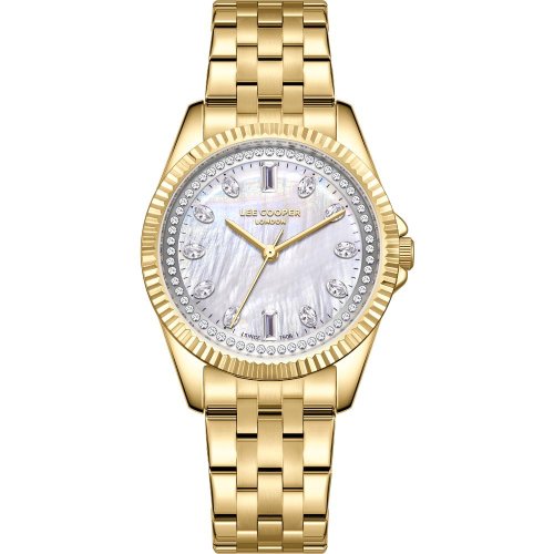 Dámské náramkové hodinky Napájení z baterie Průměr pouzdra 35,0 mm Pouzdro ve tvaru kruhu Kovové pouzdro Zlatavá barva pouzdra Kovový tah Zlatavá barva tahu Ručičkový ciferník Stříbrná barva ciferníku Ciferník s dvanácti indexy Materiál skla - minerální sklo Odolné proti vodě při běžném nošení