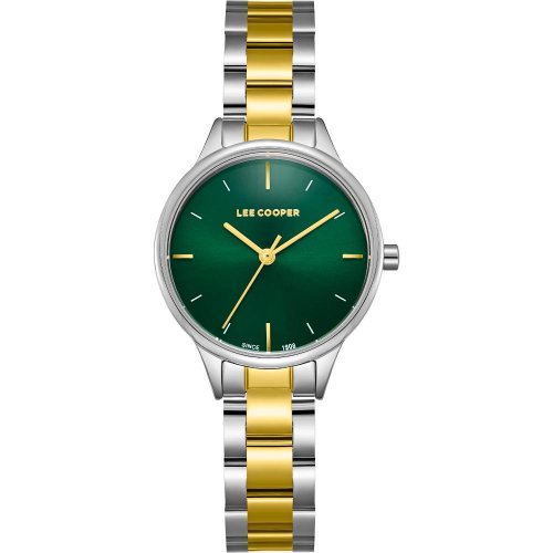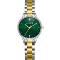 Dámské náramkové hodinky Napájení z baterie Průměr pouzdra 30,0 mm Pouzdro ve tvaru kruhu Kovové pouzdro Stříbrná barva pouzdra Kovový tah Stříbrná/zlatá barva tahu Ručičkový ciferník Zelená barva ciferníku Ciferník s dvanácti indexy Materiál skla - minerální sklo Odolné proti vodě při běžném nošení