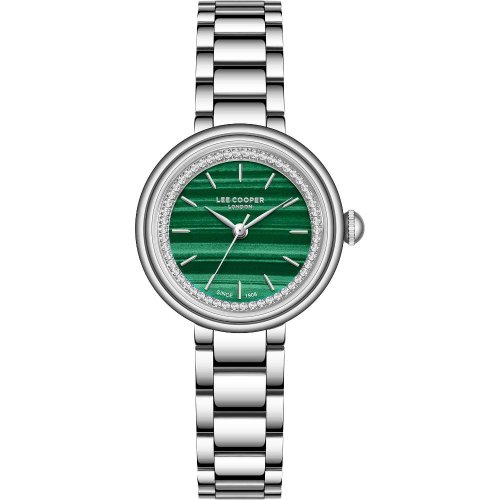 Dámské náramkové hodinky Napájení z baterie Průměr pouzdra 28,0 mm Pouzdro ve tvaru kruhu Kovové pouzdro Stříbrná barva pouzdra Kovový tah Stříbrná barva tahu Ručičkový ciferník Zelená barva ciferníku Ciferník s dvanácti indexy Materiál skla - minerální sklo Odolné proti vodě při běžném nošení