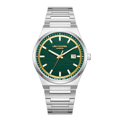 Pánské náramkové hodinky Napájení z baterie Průměr pouzdra 42,0 mm Pouzdro ve tvaru kruhu Kovové pouzdro Stříbrná barva pouzdra Kovový tah Stříbrná barva tahu Ručičkový ciferník Zelená barva ciferníku Ciferník s dvanácti indexy Materiál skla - minerální sklo Odolné proti vodě při běžném nošení