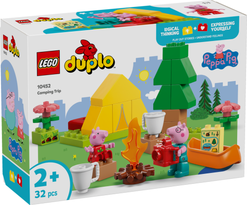 Se stavebnicí LEGO® DUPLO Prasátko Peppa se děti vydají do lesa, kde si užijí dobrodružství s prasátkem Peppou a tatínkem Malí stavitelé pomůžou prasátku Peppě a tatínkovi postavit tábor astan a pak vymyslí kreativní příběhy s modelem kánoe Tato hračka učí malé děti, jak se starat o přírodu a životní prostředí, a pomůže jim rozpoznat nové emoce během táboření venku Tato stavebnice s motivem přírody je plná kreativních prvků, se kterými se děti pustí do hraní, včetně fotoaparátu, 2 hrnečků, 2 spacích pytlů, táboráku, mapy, sestavitelného stanu, stromu a květin
