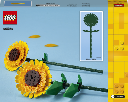 • Postavte si výstavní model slunečnic – Rozjasněte interiér výstavním modelem LEGO® slunečnic (40524). V sadě na vás čekají 2 květy slunečnic s přizpůsobitelnými zelenými stonky a listy • Zkombinujte s dalšími stavebnicemi – LEGO® slunečnice můžete vystavit samotné nebo zkombinovat s růžemi (40460), tulipány (40461) nebo kyticí (10280). Jednotlivé stavebnice se prodávají samostatně • Rozměry – Stavebnice čítá 191 dílků a hotový model slunečnic měří přes 25 cm na výšku