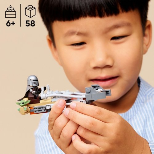 Zažehněte jiskru dětské představivosti se stavebnicí Mandalorian a Grogu a spídrová motorka Přehrajte si s nimi dobrodružství z první řady seriálu Star Wars: Mandalorian na planetě Tatooine Zahrajte si na fantasy dobrodružství s minifigurkou LEGO® Mandaloriana s blasterovou pistolí, kterou lze přeměnit na blasterovou pušku, a figurkou LEGO Grogua Tato spídrová motorka je navržena k rychlému sestavení, aby se děti mohly hned pustit do hraní Připevněte Mandalorianovu blasterovou pušku na zadní část spídrové motorky, posaďte ho na sedadlo řidiče a Grogua umístěte do brašny připevněné na boku